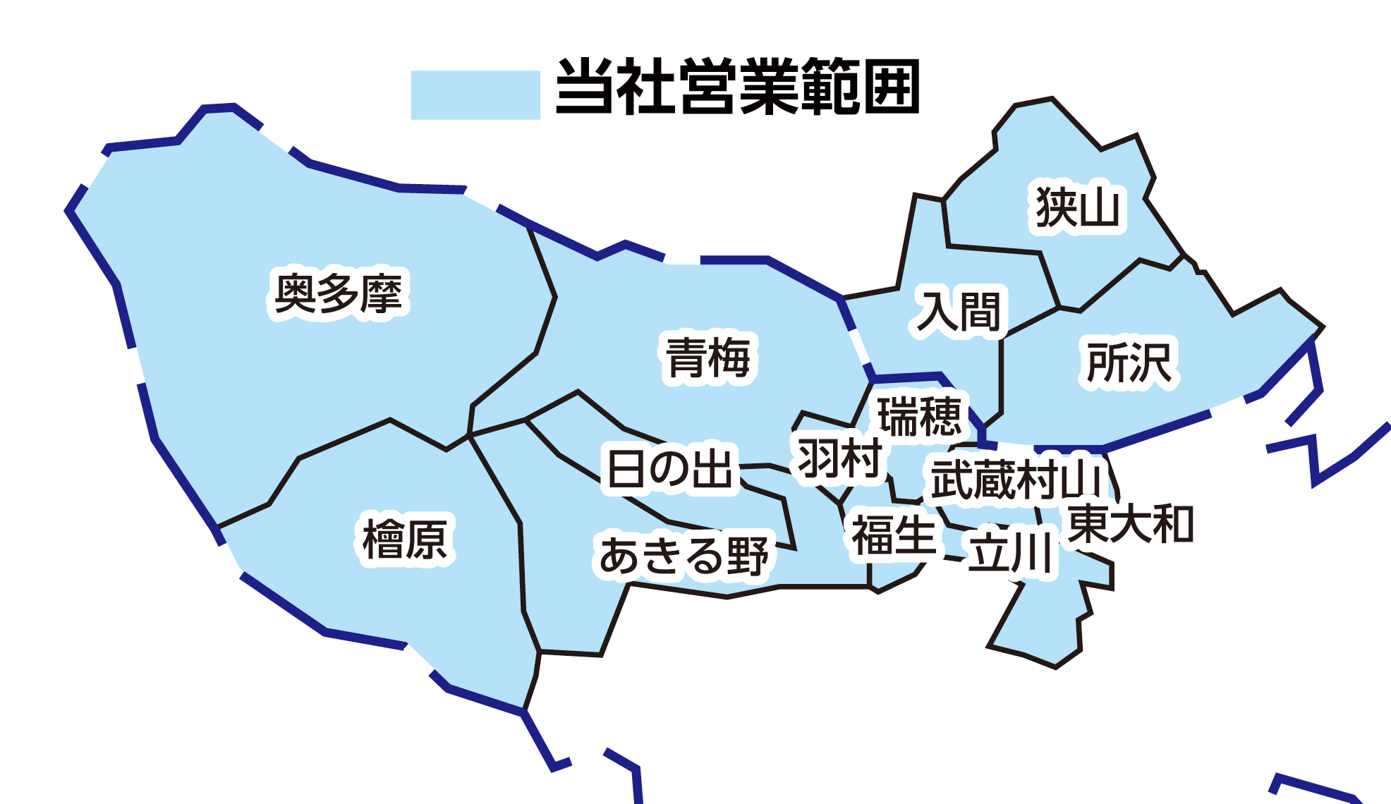 営業範囲は、青梅市周辺になります(図参照)が、営業範囲外の場合でもご遠慮なくご相談ください。(納品等は郵送になります)また営業範囲内でも、納品がお急ぎの場合や日付指定の場合は郵送になる時があります。郵送の場合は送料のご負担をお願いしております。
